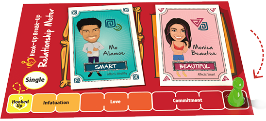 When you have an “other half” card placed next to your avatar on the relationship board, and your pawn is on the “Hooked-Up” mark, this means you are in a relationship, and you can roll the relationship die on your turn: